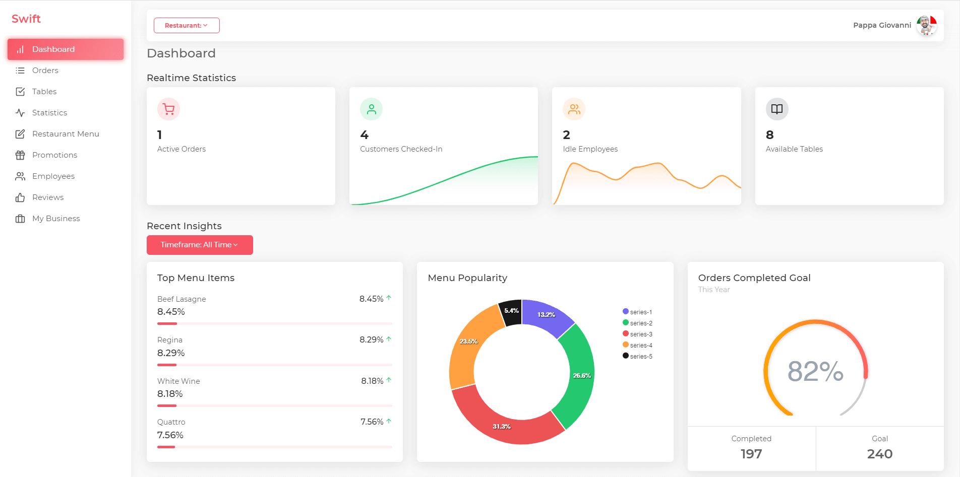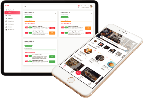 Swift consists of a customer and a management application that offers services such as order management, business logic, creating a customisable menu, live order status tracking, Augmented Reality menu items, Machine Learning recommendations, and many more.