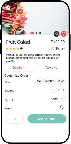 Menu ItemOnce you are on the specific menu item’s page, you are provided with ratings left by other users, the item’s description, the esti- mated preperation time and more. From here you can customise the item by selecting the Size, Quanitity and the various specific attributes of each item. Select the attributes you prefer and click “Add To Order” if you wish to purchase this menu item.